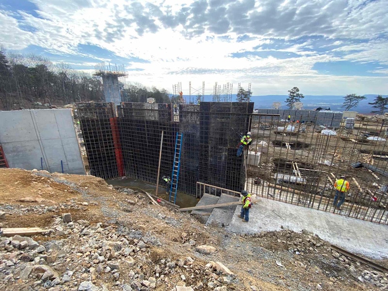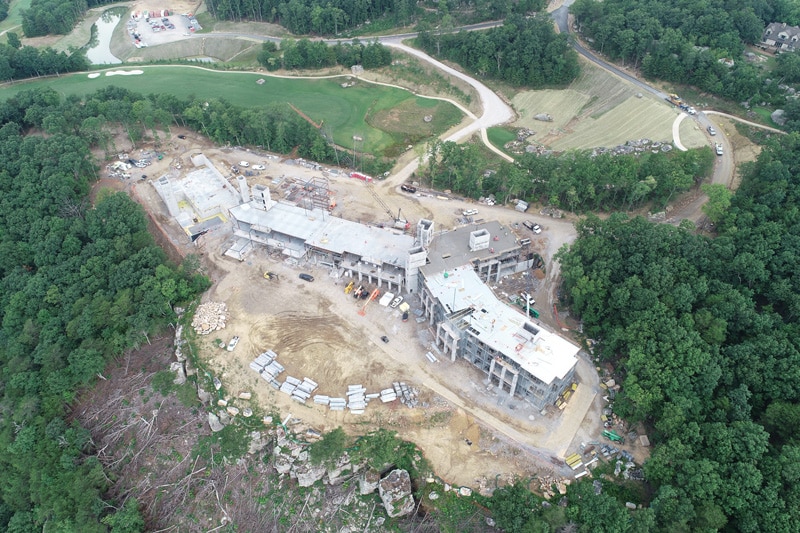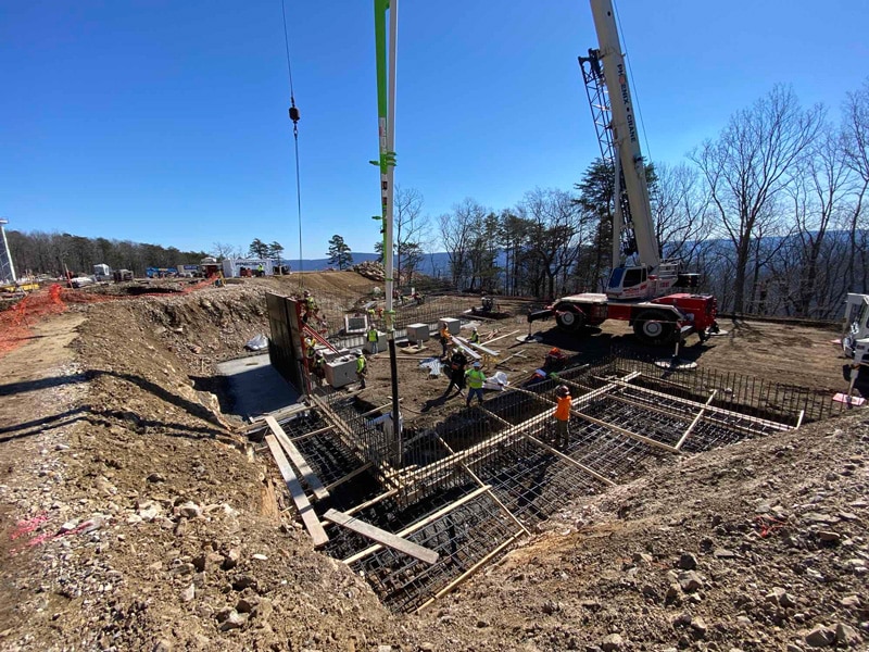 Adding to the challenge, the resort’s footprint intersected with both a hillside and active golf course play areas. Large rock formations needed blasting and removal to establish deep shear foundations, while Precision’s crews often navigated material deliveries around golfers teeing off on the course’s first hole. Despite these logistical hurdles, the team’s close coordination with the general contractor, New South Construction Company, kept the project moving forward.